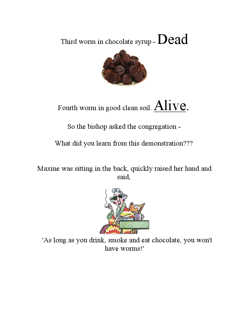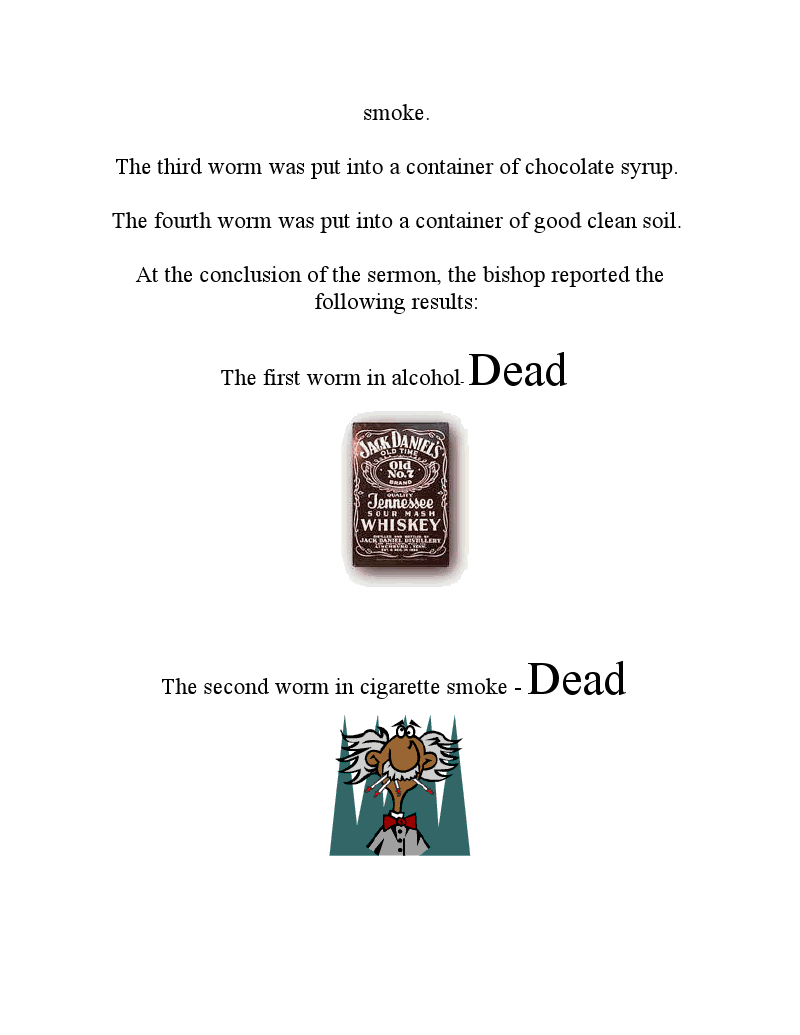 A bishop decided that a visual demonstration would add emphasis to his Sunday talk on the Word of Wisdom. Four worms were placed into four separate jars. The first worm was put into a container of alcohol. The second worm was put into a container of cigarette smoke. The third worm was put into a container of chocolate syrup. The fourth worm was put into a container of good clean soil. At the conclusion of the sermon, the bishop reported the following results: The first worm in alcohol- Dead